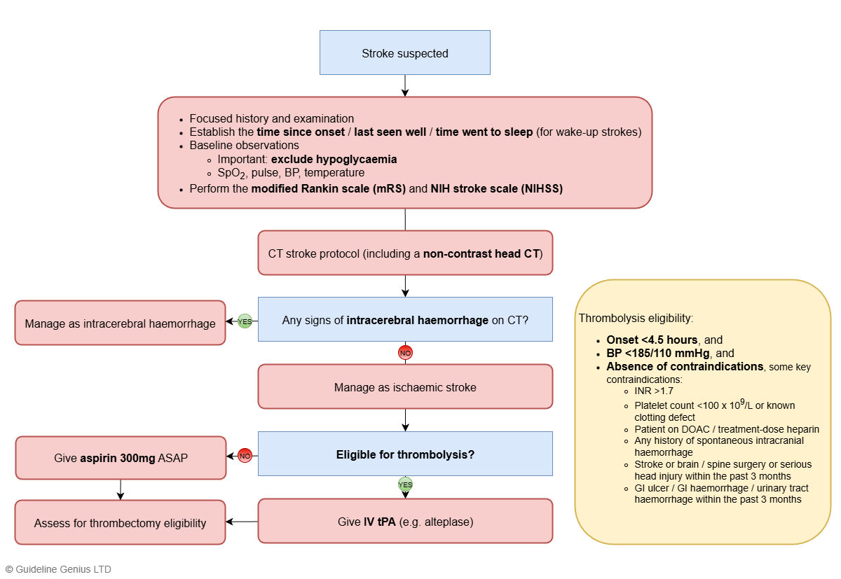 - Intracranial haemorrhage (should be excluded with non-contrast CT head)