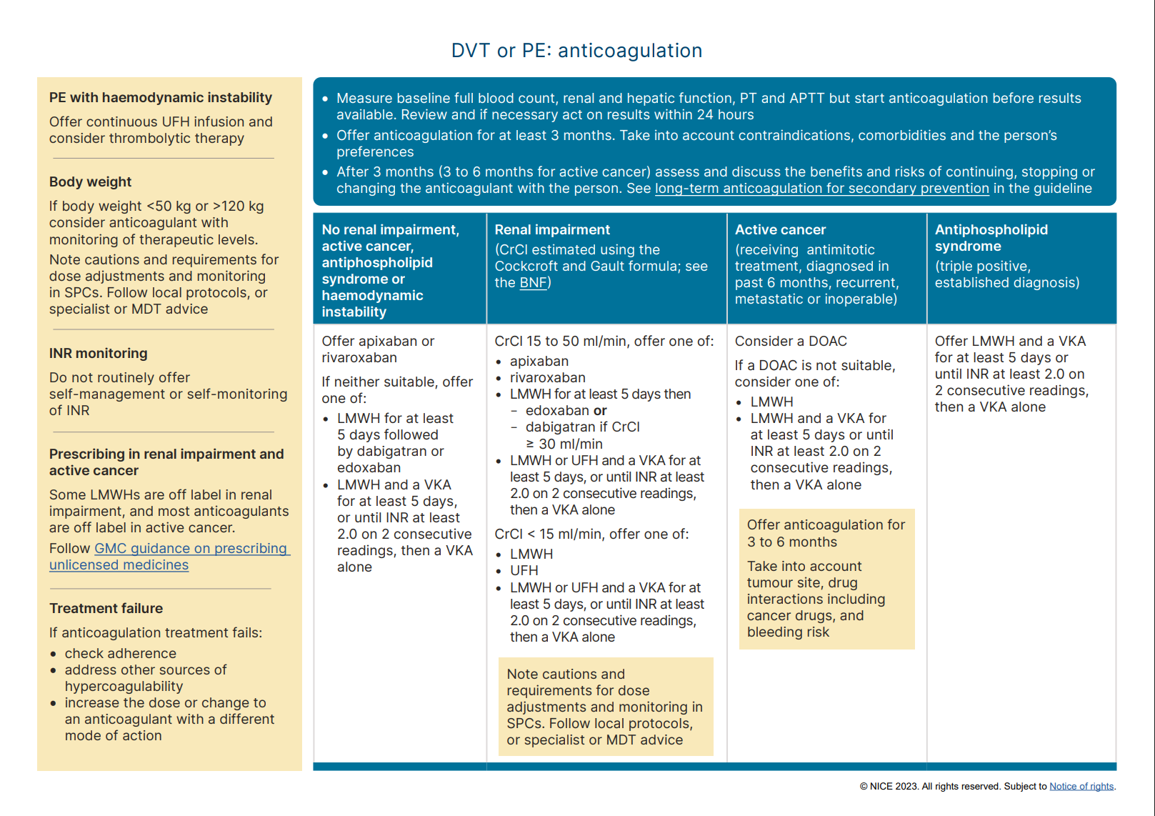 NICE guideline [NG158] Venous thromboembolic diseases: diagnosis, management and thrombophilia testing. Last updated: Aug 2023.
